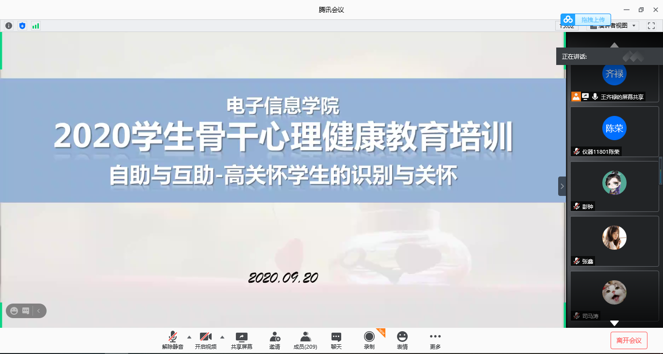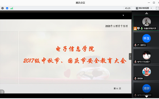 为加强学生心理健康教育,提高学生骨干应对心理问题的能力,强调假期安全及毕业规划的重要性,920-26日,我院2017级、2018级、2019级学生通过线上、线下等多种形式开展了以“自助与互助-高关怀学生的识别与关怀”为主题的心理骨干培训及中秋节、国庆节安全教育大会,电信学院各年级辅导员担任讲,各年级班长、团支书、安全委员、心理委员、寝室长参加了此次培训。