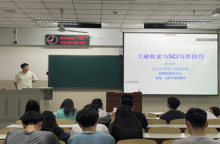 首先由电子信息学院李光平同学为大家分享的主题是“文献检索及SCI写作”,他充分的讲解了文献检索的作用以及如何利用endnote工具管理文献,再利用好学校图书馆文献资源与各类技术交流论坛资源来写好SCI论文,详细的从告知阅读文献的第一步到撰写论文方法再到讲解论文的基本结构,层层递进告诉研一同学们写论文方法。