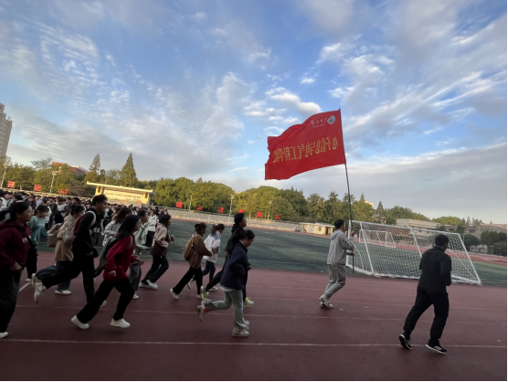 升旗仪式结束,全体学生开展“健康跑”活动。