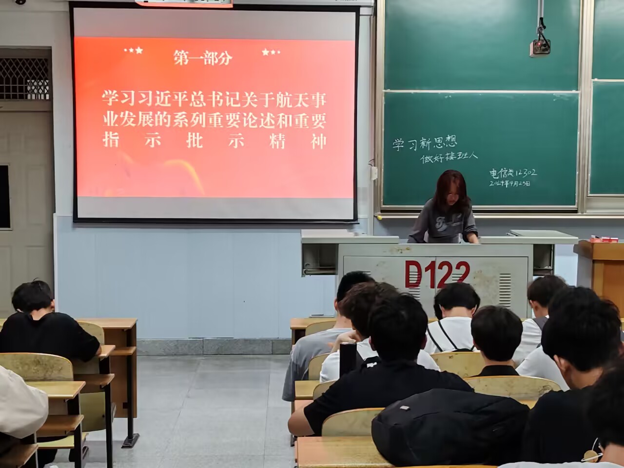 4月23日下午,人工智能12201班于16教B106室开展团日活动。团支部书记南林江带领同学们深入学习了习近平总书记关于航天事业发展的系列重要论述和指示精神,主持人鼓励大家积极参与学科竞赛,培养创新精神。最后,南林江同学向入党积极分子强调了理论学习和入党培训的重要性。