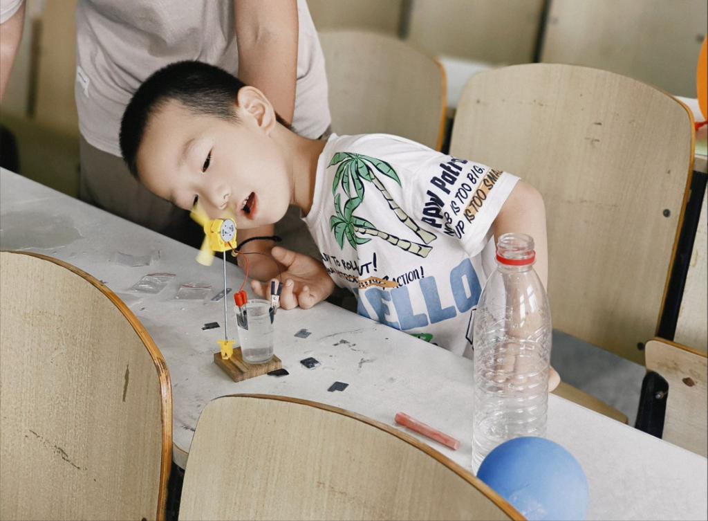 7月8日下午2时许,“愿益”社会实践团队带领长江大学周边社区中小学生来到长江大学12教1楼,带领他们亲身参与人工智能小实验中,感悟科技的奥妙。在科技展里,“愿益”团队本科生实践队选择以科普小游戏为切入点,向中小学生展示电子信息学院学生的课程设计作品,帮助他们了解科技文化知识,并激发他们对科学技术的兴趣。除了理论知识外,团队开展了科技小课堂活动——“盐水发电”、“柠檬电池”、“动力气流”等诸多模块,并配有专门的志愿者进行演示,向他们讲解其中的实验原理,然后在志愿者的监护下,让小朋友也可以尝试这样的小实验。让孩子们亲自参与一些简单的应用实验,从而增强孩子们的动手能力,将所学知识与实际应用联系起来。