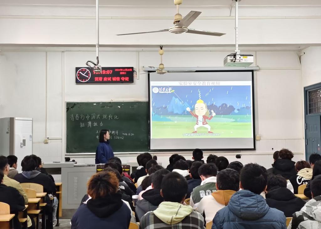 11月20日上午九点,电气32401班组织的十一月班团会在2教206顺利举行。团支书卢娇洋强调了新时代背景下青年学生肩负的重要使命,鼓励大家将个人成长与国家发展紧密相连,积极投身中国式现代化建设的伟大征程。本月是实验室安全月,为了增强学生的实验室安全意识,在班团会进行的结尾,主持人带领大家观看了实验室安全教育视频,视频内容涵盖了实验室基本安全规则、紧急情况处理等多个方面,通过有趣的动画,向学生们展示了实验室安全的重要性。