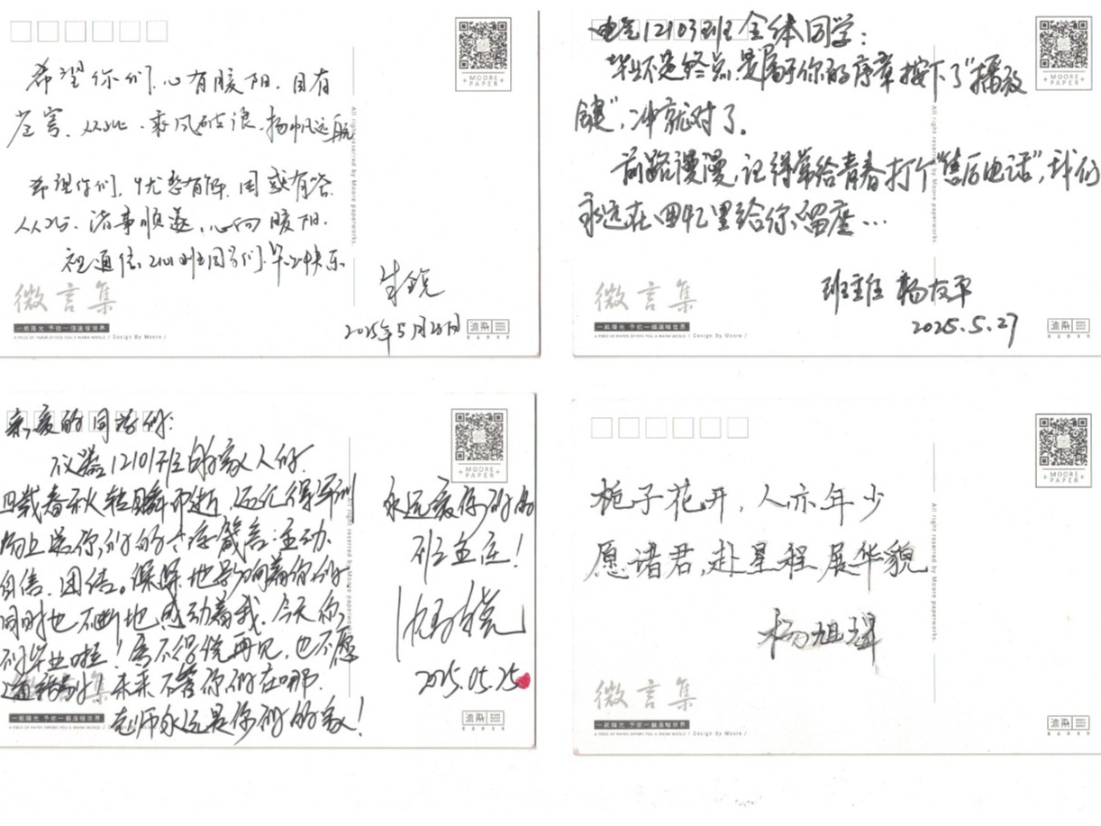 同窗情深,彰显明信片里的青春印记。在“致同窗”环节,同学们互写祝福明信片,既有“愿我们江湖再见时,你仍是追风少年”的豪迈,也有“记得帮我占图书馆座位的情谊”的俏皮回忆。一张张明信片成为同窗情谊的“时光胶囊”。
