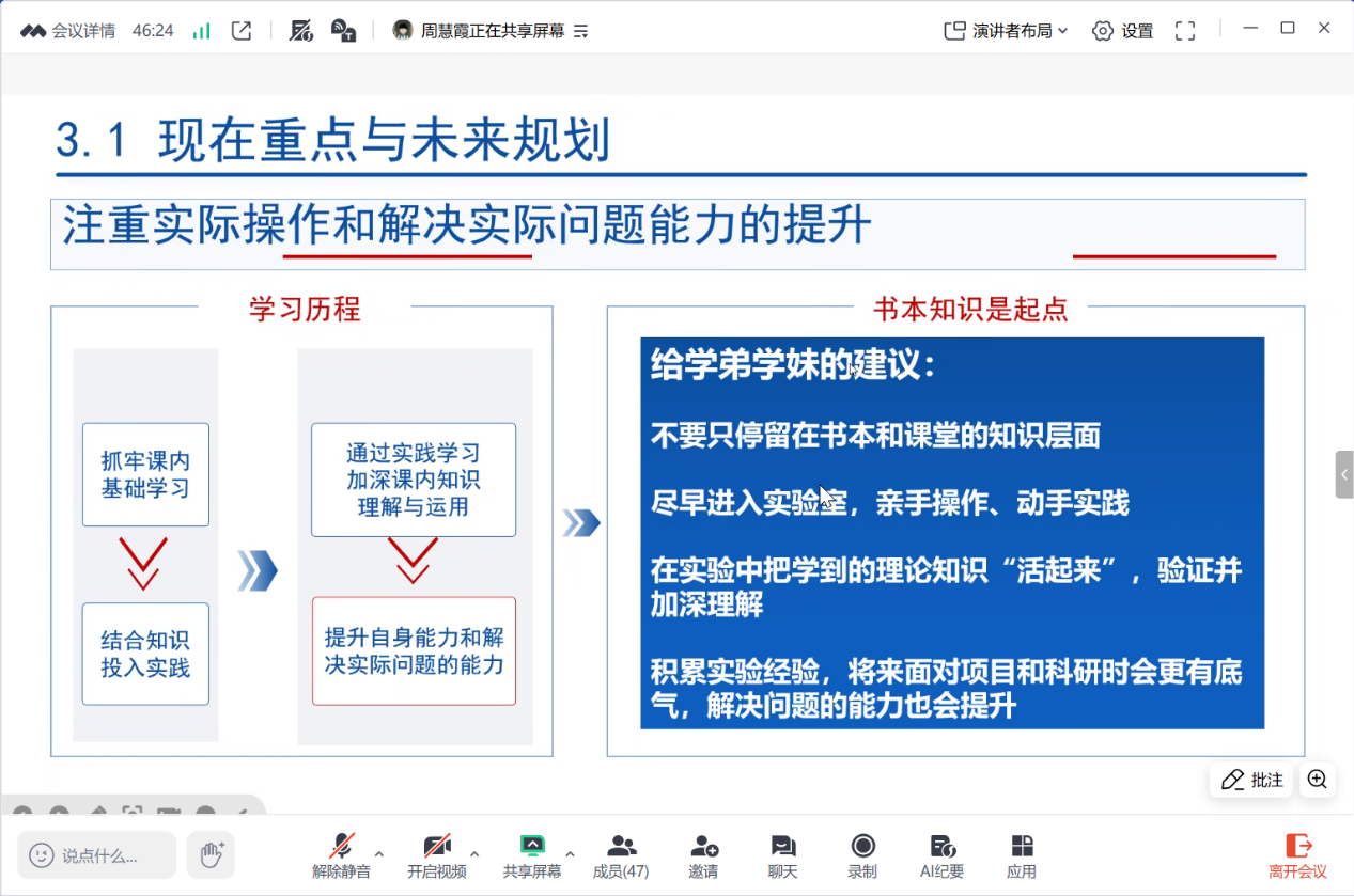 本次活动特别邀请到电气12201班栾志强同学与信工12202班叶顺同学担任主讲人。两位同学均在多项高水平学科竞赛中斩获佳绩并已成功推免为硕士研究生,具备丰富的实战经验。两位同学先后介绍了学校的竞赛体系、竞赛准备,分享了自己的项目经历和经验,并对现场的同学们提出了宝贵的经验。