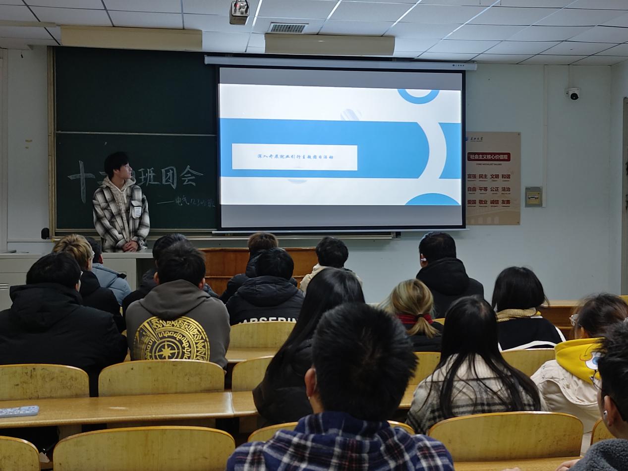 12月20日晚七点,仪器12201团支部在东13教D524开展十二月班团会。在班团会上,主持人刘雅欣同学带领同学们学习“挺膺担当”专题,深入学习习近平总书记关于青年工作的重要思想,重点学习习近平总书记对青年一代的殷切希望和重要要求,激发强国有我的青春激情,争做有理想、敢担当、能吃苦、肯奋斗的新时代好青年,在中国式现代化建设中挺膺担当。刘雅欣同学带领班上同学深入开展就业引航主题团日活动,许多同学对自己未来的职业规划畅所欲言,大家对将来就业岗位产生激烈讨论,这不仅帮助学生们强化了就业意识,也初步明确了就业发展方向。最后,刘雅欣督促同学们参与“青年大学习”网上主题团课学习。