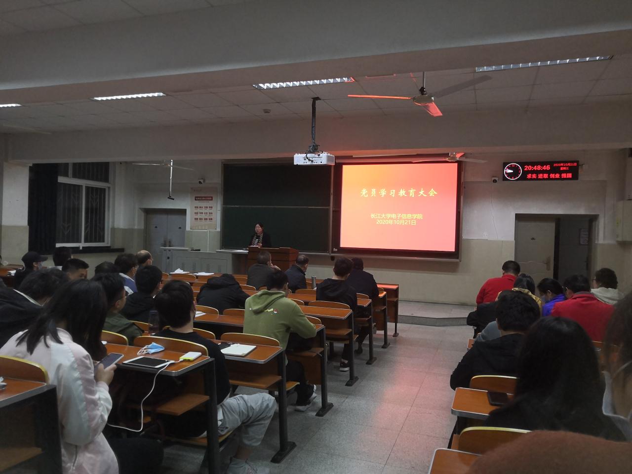2020年10月21日晚19:30分,电子信息学院在主教107教室组织召开电信学院党员大会和《习近平谈治国理政》第三卷学习报告会,电信学院教师、学生党员和入党积极分子参加会议。马克思主义学院卢军老师受邀作学习报告,会议由电信学院分党委书记刘逸主持。