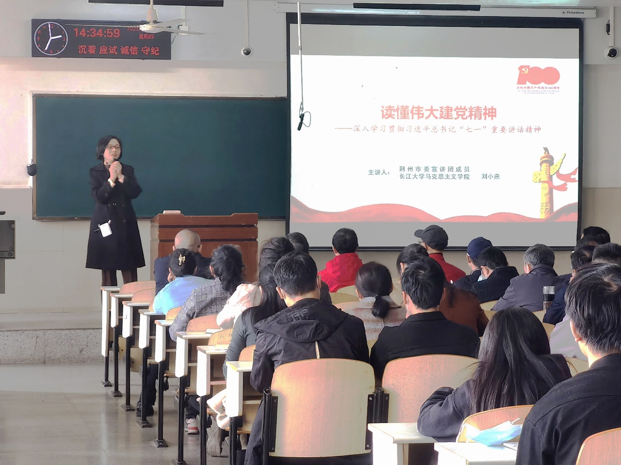 学习习近平“七一”重要讲话精神特邀荆州市委宣讲团成员、马克思主义学院党委书记刘小燕老师担任主讲人。刘小燕书记围绕伟大建党精神的历史渊源、科学价值、时代价值三个方面进行分析读懂伟大建党精神。首先通过“重视历史教育是中国共产党的优良传统”、“学史明理、增信、崇德、力行”以及“启智润心,汲取智慧和力量”这三点得出结论读懂伟大建党精神“正当其时,十分必要”。随后又通过伟大建党精神的丰富内涵明确指出伟大建党精神是中国共产党人精神谱系的源与本、根与魂。最后刘小燕通过伟大建党精神的时代价值讲到当下全党正在深入学习领会习近平“七一”重要讲话精神,但最重要的是要带着感情学,联系实际学,学出共产党人的定力,学出中华民族的豪情,学出对百年辉煌的景仰,学出对面向未来的信心。只要各行各业都能学有所思而不浅尝辄止,学有所悟而又知行合一,“十四五”规划一定能开好局、起好步,全面建成社会主义现代化强国的目标一定能够实现。社会主义没有辜负中国,中国也永远不会辜负社会主义!