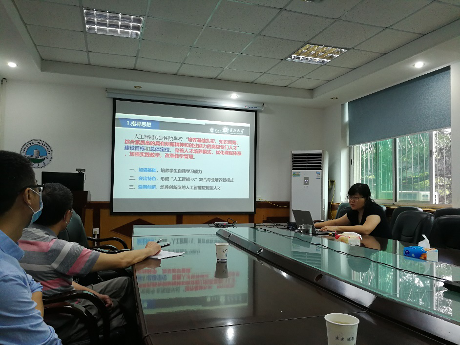 学院在2019年上半年已经开始着手人工智能专业申报的准备工作,调研了已有该专业的其他高校的人工智能专业的培养计划、课程体系和实施方案,论证了电信学院以现有的基础时可以完成人工智能专业人才培养的要求的。在学院的的统筹安排下,成立了以孙祥娥教授为首人工智能专业申报小组,先期完成了人工智能专业设置申报书和专业建设规划。本次会议首先听取了孙院长关于专业申报的前期工作汇总报告,接着讨论了专业申报答辩的材料准备工作,明确了学院在该专业申报上的义不容辞,且学院的学科建设、办学经验、人才质量等方面的优势明显。最后就汇报PPT的组织上,大家群策群力,具体到图表数据的组织和展示方式。