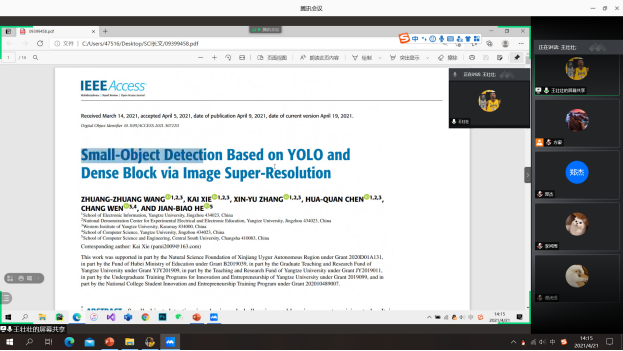 【通讯员 李思平 陈宇璇】2021年4月21日下午,电信学院“研究生论文写作与投稿经验交流会”顺利举行。本次交流会由电子信息学院承办,电信学院学生会进行组织,参加会议人数为61人。交流会为响应国家疫情期间避免扎堆的政策,决定在线上进行展示。学院邀请了王壮壮等几位有论文成果的研究生同学分享他们的经验。会前,由学生会副主席方豪做会前陈述,会间,报告的同学着重分享了润色论文的经验,详细阐述了论文发表的具体流程,并和大家展示了自己的成果。全体研究生积极地参与其中,热烈讨论。
