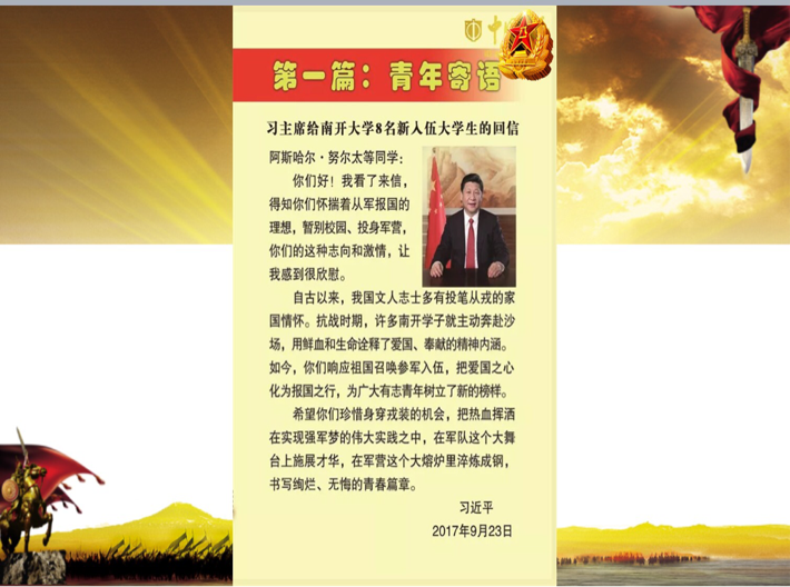 通过此次的征兵宣讲活动,增强了我院大一新生的国防意识和参军热情,激发了适龄新生报名参军、献身国防的自觉性和积极性,为我院征兵工作夯实了基础,相信广大学子会在以后的学习生活中为自己的青春增添浓墨重彩的一笔。