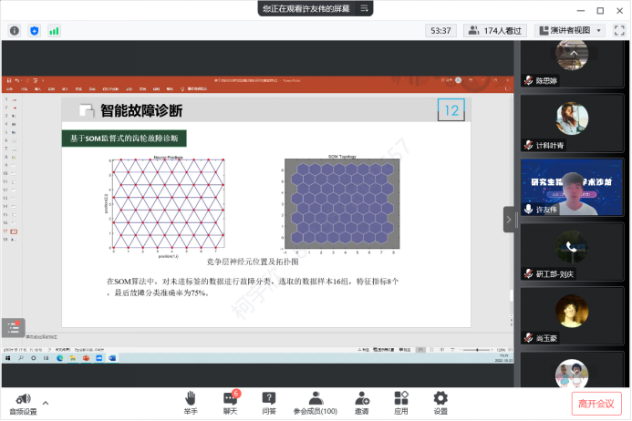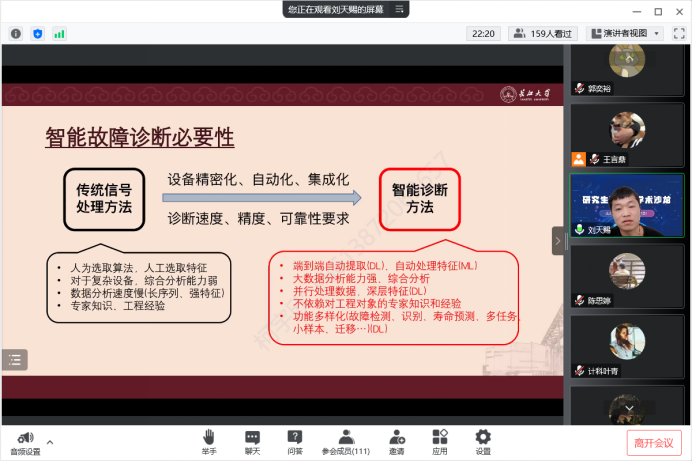 来自机械工程学院许友伟同学以《基于齿轮传动系统智能诊断的研究》为题,讲述了全球因机械故障导致的重大伤亡事件背景下智能设备故障诊断技术研究迫在眉睫,对比不同特征集来源下的齿轮故障诊断准确率,讲解了包络谱分析在特征提取方面可以更好作为齿轮故障类别识别的特征提取方法。